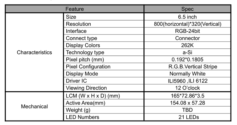 > 產(chǎn)品中心 > 定制液晶屏 > 6.5寸電容觸摸長條屏